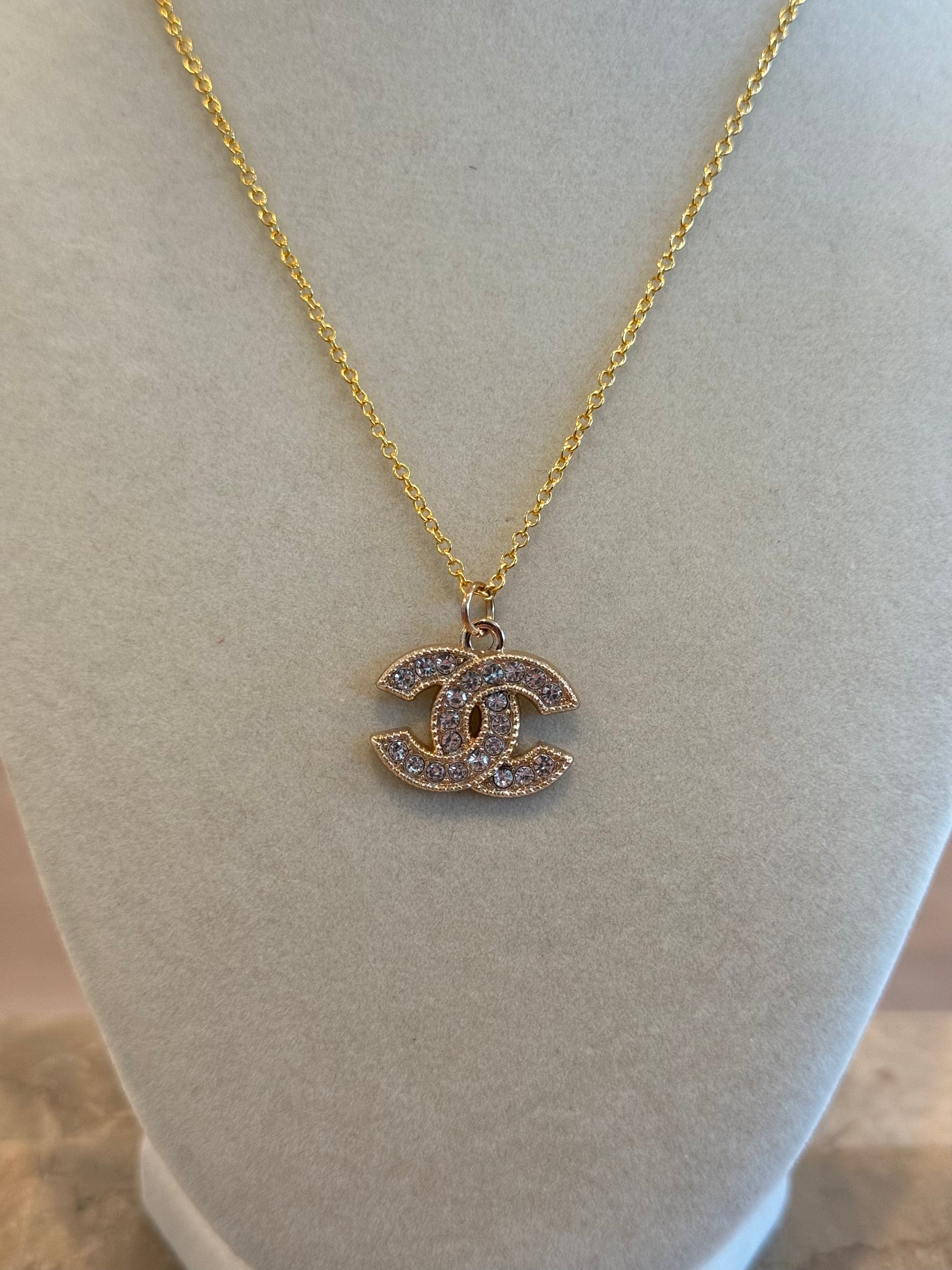The luxury handmade jewelry necklace features a delicate gold chain with a striking pendant showcasing the iconic interlocking "CC" logo. The pendant is embellished with sparkling clear gemstones, likely rhinestones or crystals, adding a touch of glamour. The craftsmanship reflects high-quality materials and meticulous detail, exuding elegance and sophistication. It is displayed on a neutral fabric stand against a soft background.